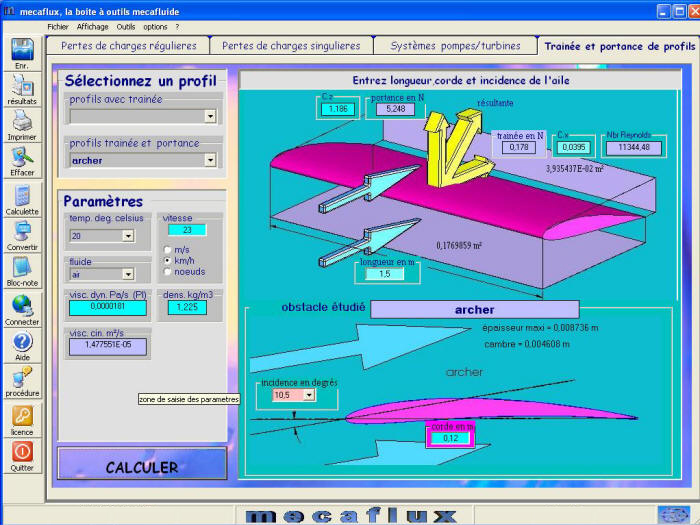 Calculs de frottement d'une surface dans un courant de fluide. Le logiciel calsol est un logiciel pédagogique de calcul énergétique, économique et environnemental sur des installations solaires photovoltaïques, solaires thermiques et solaires passives. Entrez les dimensions de la surface, sa rugosité, la vitesse relative du fluide, choisissez le fluide. Une fois la surface identifiée, le logiciel vous aide à choisir le nombre correct de modules en fonction des critères de conception définis. Mecafluid est un logiciel de calcul d'hydraulique à surface libre, en régime permanent et à géométrie paramétrée, à double objectif d'utilisation :